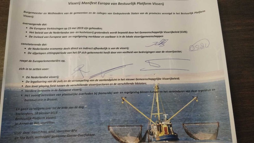 Nederland mag en moet trots zijn op de vissers. Die zijn innovatief en concurrerend. Maar er komen nu wel veel bedreigingen af op de sector. Er is Brexit, windmolens, aanlandplicht en nog veel meer. Daarom hebben Europarlementariërs getekend, samen met de wethouders Post en Both namens het Bestuurlijk Platform Visserijgemeenten waarin 20 gemeenten die veel visserij kennen, samenwerken.